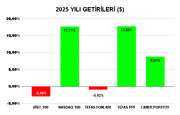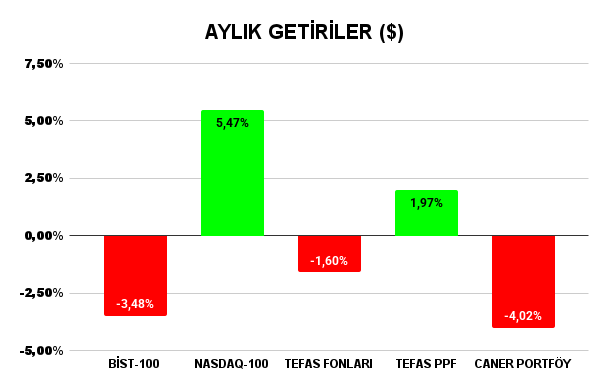 Öncelikle portföy getirimi her zamanki gibi aylık ve 2025 başından itibaren olarak iki farklı tabloda kıyaslayalım. Tablolardaki BİST100 ve NASDAQ100 verileri temettüler dahil dolar bazlı hesaplandı. TEFAS PPF sütunu son 5 yılın en başarılı 10 para piyasası fonunun ortalama dolar bazlı brüt(vergi hariç) getirisini, TEFAS fonları sütunu ise son 5 yılın en başarılı 10 tematik olmayan değişken fonunun ortalama dolar bazlı brüt getirisini gösteriyor.