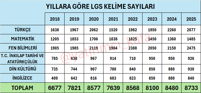 Liselere Geçiş Sistemi yani LGS, 8. sınıf öğrencilerimizin geleceğini şekillendiren önemli bir dönüm noktası. Bu sınavda öğrencilerin karşısına çıkan kelime sayıları kitap okuma alışkanlığının neden bu kadar önemli olduğunu gözler önüne seriyor. Aşağıdaki tabloya yıllara göre LGS sınavındaki kelime sayılarını işledim👇🏻