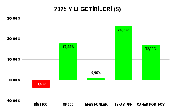 Sene başında %50 olan PPF ağırlığımı zaman içerisinde %15’e kadar düşürdüm. Özellikle 19 Mart sonrası BİST’teki düşüşle birlikte hisse senetlerindeki artan iskonto oranı, politika faizinin gerilemesiyle birlikte PPF’lerden gelecek 12 ay için reel getiri beklentimin gerilemesi portföydeki BİST ağırlığımı artırıp PPF ağırlığımı düşürmeme neden oldu. Yılın sonunda baktığımda portföyüm seneyi dolar bazlı %17,11, TL bazlı %42 getiriyle kapattı. Yıl boyunca minimum %50 BİST(max %90, ortalama %75) pozisyonu olan birine göre BİST100’ün -%3,63 yaptığı yılda +%17,11 getiriyi gayet iyi buluyorum. Ancak yine de BİST’e fazla güvenip portföydeki ağırlığını yüksek tutmam getirimi oldukça düşürdü. Tüm sene hiçbir şey yapmasam bile paramı PPF’ye yatırıp dolar bazlı %22(vergiler sonrası) getiri elde edebilirdim. Umarım hisselerim güvenimi 2026’da tazeler 🙂